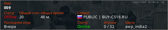 Играет на Counter Strike 1.6 сервере. Страна: РоссияПервый раз замечен 12:49 31.03.2026
