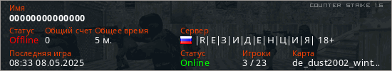 Играет на Counter Strike 1.6 сервере. Страна: РоссияПервый раз замечен 08:21 08.05.2025