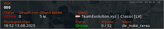 Играет на Counter Strike 1.6 сервере. Страна: ЛатвияПервый раз замечен 18:27 15.08.2025