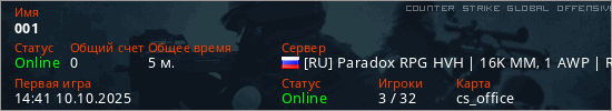 Играет на Counter Strike Global Offensive сервере. Страна: РоссияПервый раз замечен 14:41 10.10.2025