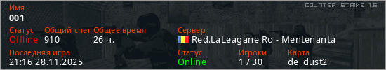 Играет на Counter Strike 1.6 сервере. Страна: РумынияПервый раз замечен 00:24 20.08.2022
