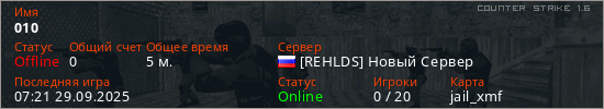 Играет на Counter Strike 1.6 сервере. Страна: РоссияПервый раз замечен 07:19 29.09.2025