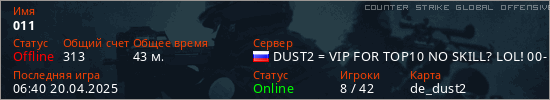 Играет на Counter Strike Global Offensive сервере. Страна: РоссияПервый раз замечен 15:06 18.04.2025