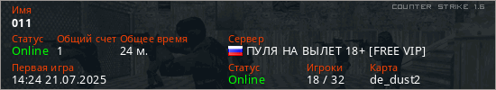 Играет на Counter Strike 1.6 сервере. Страна: РоссияПервый раз замечен 14:24 21.07.2025