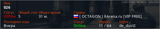 Играет на Counter Strike Source сервере. Страна: РоссияПервый раз замечен 18:47 11.04.2026