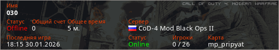 Играет на Call of Duty 4: Modern Warfare сервере. Страна: РоссияПервый раз замечен 17:58 30.01.2026