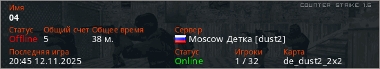 Играет на Counter Strike 1.6 сервере. Страна: РоссияПервый раз замечен 11:11 08.10.2023