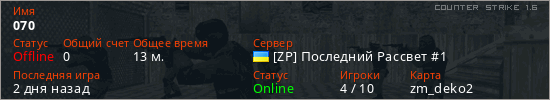 Играет на Counter Strike 1.6 сервере. Страна: УкраинаПервый раз замечен 21:21 18.03.2026