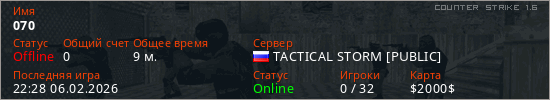 Играет на Counter Strike 1.6 сервере. Страна: РоссияПервый раз замечен 20:51 06.02.2026