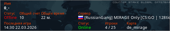 Играет на Counter Strike Global Offensive сервере. Страна: РоссияПервый раз замечен 18:22 07.03.2026