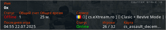 Играет на Counter Strike 1.6 сервере. Страна: РумынияПервый раз замечен 02:36 12.07.2025