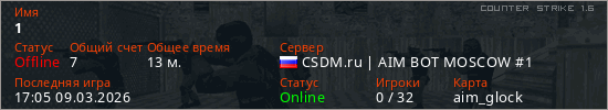 Играет на Counter Strike 1.6 сервере. Страна: РоссияПервый раз замечен 13:12 27.02.2026