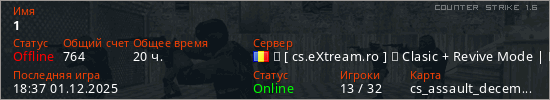 Играет на Counter Strike 1.6 сервере. Страна: РумынияПервый раз замечен 20:07 26.10.2024