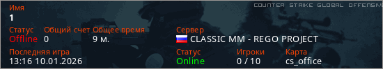 Играет на Counter Strike Global Offensive сервере. Страна: РоссияПервый раз замечен 21:42 31.12.2025