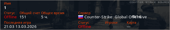 Играет на Counter Strike Source сервере. Страна: РоссияПервый раз замечен 20:09 05.09.2025