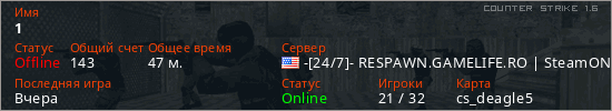 Играет на Counter Strike 1.6 сервере. Страна: СШАПервый раз замечен 23:14 29.01.2025