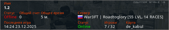 Играет на Counter Strike 1.6 сервере. Страна: РоссияПервый раз замечен 14:19 23.12.2025