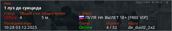 Играет на Counter Strike 1.6 сервере. Страна: РоссияПервый раз замечен 10:24 03.12.2025