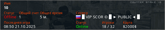 Играет на Counter Strike 1.6 сервере. Страна: РоссияПервый раз замечен 08:24 21.10.2025