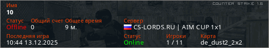 Играет на Counter Strike 1.6 сервере. Страна: РоссияПервый раз замечен 10:01 13.12.2025