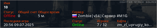 Играет на Counter Strike Source сервере. Страна: РоссияПервый раз замечен 20:54 09.07.2025