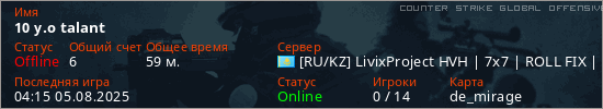 Играет на Counter Strike Global Offensive сервере. Страна: КазахстанПервый раз замечен 03:14 29.07.2025