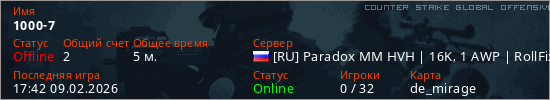 Играет на Counter Strike Global Offensive сервере. Страна: РоссияПервый раз замечен 17:37 09.02.2026