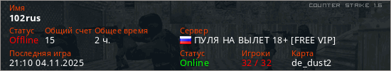 Играет на Counter Strike 1.6 сервере. Страна: РоссияПервый раз замечен 22:41 09.09.2025
