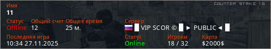 Играет на Counter Strike 1.6 сервере. Страна: РоссияПервый раз замечен 06:17 29.08.2025