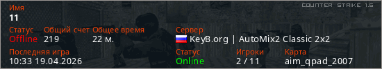 Играет на Counter Strike 1.6 сервере. Страна: РоссияПервый раз замечен 22:29 18.04.2026