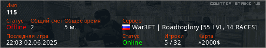 Играет на Counter Strike 1.6 сервере. Страна: РоссияПервый раз замечен 21:54 02.06.2025