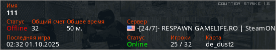 Играет на Counter Strike 1.6 сервере. Страна: СШАПервый раз замечен 12:04 29.01.2025