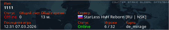 Играет на Counter Strike Global Offensive сервере. Страна: РоссияПервый раз замечен 18:11 05.03.2026