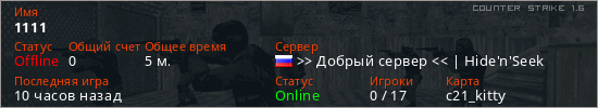 Играет на Counter Strike 1.6 сервере. Страна: РоссияПервый раз замечен 19:03 05.12.2025