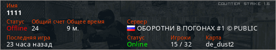Играет на Counter Strike 1.6 сервере. Страна: РоссияПервый раз замечен 12:56 02.02.2026