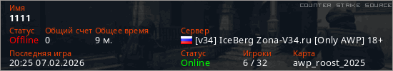 Играет на Counter Strike Source сервере. Страна: РоссияПервый раз замечен 18:25 07.02.2026