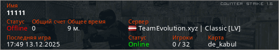 Играет на Counter Strike 1.6 сервере. Страна: ЛатвияПервый раз замечен 20:39 08.12.2025