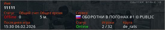Играет на Counter Strike 1.6 сервере. Страна: РоссияПервый раз замечен 15:11 06.02.2026