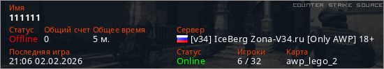 Играет на Counter Strike Source сервере. Страна: РоссияПервый раз замечен 21:03 02.02.2026