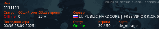 Играет на Counter Strike Global Offensive сервере. Страна: РоссияПервый раз замечен 11:11 26.09.2025