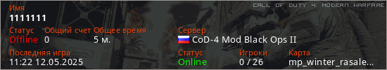 Играет на Call of Duty 4: Modern Warfare сервере. Страна: РоссияПервый раз замечен 11:20 12.05.2025