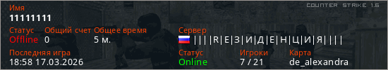 Играет на Counter Strike 1.6 сервере. Страна: РоссияПервый раз замечен 18:56 17.03.2026