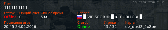 Играет на Counter Strike 1.6 сервере. Страна: РоссияПервый раз замечен 20:43 24.02.2026