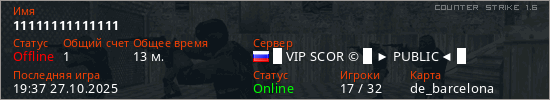 Играет на Counter Strike 1.6 сервере. Страна: РоссияПервый раз замечен 15:20 19.09.2025