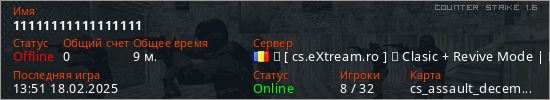 Играет на Counter Strike 1.6 сервере. Страна: РумынияПервый раз замечен 13:33 18.02.2025