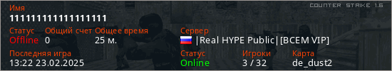 Играет на Counter Strike 1.6 сервере. Страна: РоссияПервый раз замечен 21:55 17.02.2025