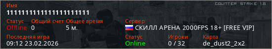 Играет на Counter Strike 1.6 сервере. Страна: РоссияПервый раз замечен 08:58 23.02.2026