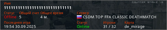 Играет на Counter Strike 1.6 сервере. Страна: РоссияПервый раз замечен 19:52 30.09.2025