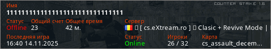 Последний раз был в сети 16:40 14.11.2025 Игрок с таким ником замечен на 31 сервере
