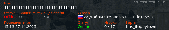Последний раз был в сети 15:13 27.11.2025 Игрок с таким ником замечен на 31 сервере